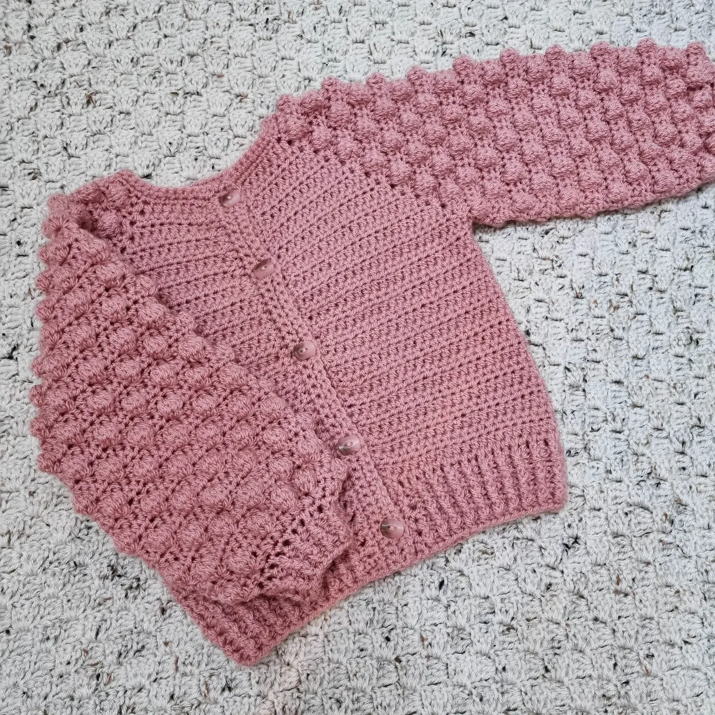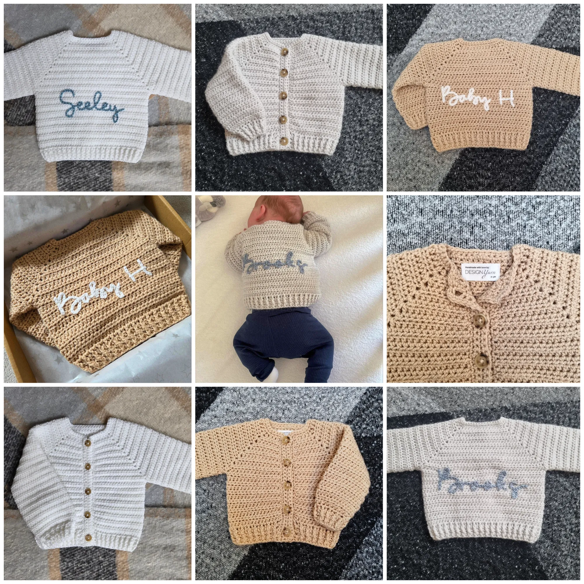 Hand crocheted 'Indy Cardigan' (pattern written by Home of the Hook) with optional bobble sleeves and name/phrase embroidery on the back.